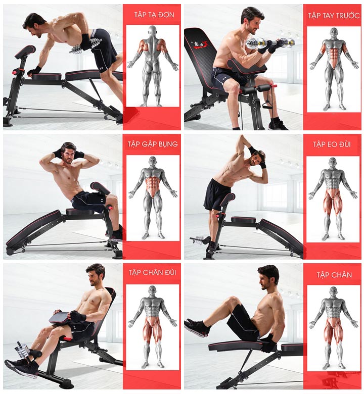 - Lưng tựa điều chỉnh độ dốc để thực hiện các bài đẩy ngực với tạ đơn, đòn tạ dài hay có thể sử dụng như một chiếc ghế tập bụng