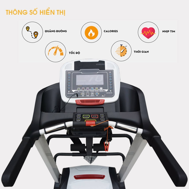 Màn hình hiển thị: Thời gian, tốc độ, quãng đường, calo tiêu hao và nhịp tim