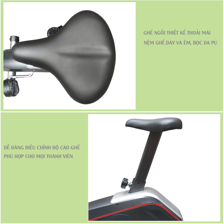 - Ghế ngồi thiết kế tạo sự thoải mái dễ chịu khi tập luyện, nệm bằng cao su tự nhiên dày và êm ái, bọc da PU tăng độ bền và thẩm mỹ. Độ cao ghế ngồi có thể điều chỉnh theo thể hình từng người, vì vậy với xe đạp tập TK-900 thì người lớn hay trẻ em đều sử dụng được.