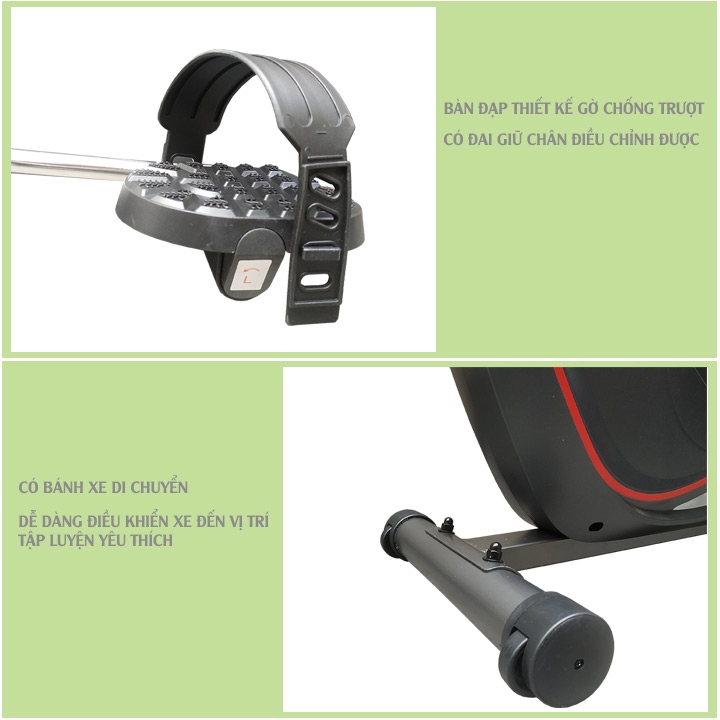 - Bàn đạp của xe đạp tập chân Tokado TK-900 có thiết kế rãnh bám chống trượt và đai giữ chân an toàn. Rất thích hợp để người già, người bệnh mới mổ đầu gối tập luyện phục hồi chức năng vận động nâng cao sức khỏe.